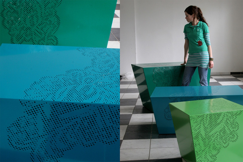 Tootjafirma tehnilisest baasist lähtuvalt valmisid lõputööks erineva suurusega aukudest moodustuva mustriga skulptuurse vormiga lehtmetallist lauad. Sama võtet saab kasutada ka muu poesisustuse dekoreerimiseks erinevate mustrite, brändi tunnusgraafika vms sobivaga ning lisaväärtusena võib kasutada LED- või luminofoorvalgust laua all või riiulite tagaseinte taga.